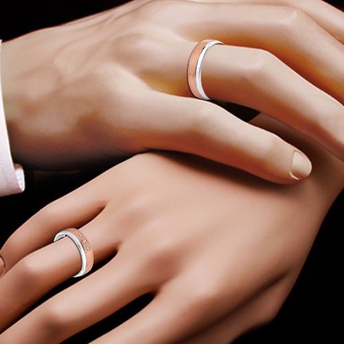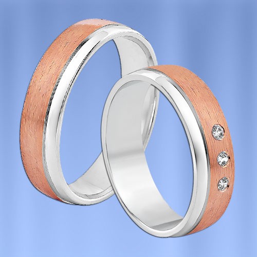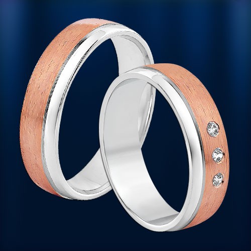 Оригинальное и модное двухцветное обручальное кольцо из красного и белого золота 585 пробы с бриллиантами ( 3 х 0,02 карата) (матовая текстура)