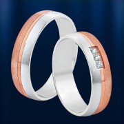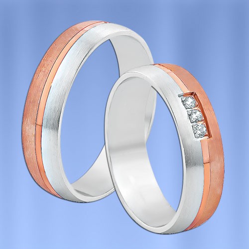 Оригинальное, модное двухцветное обручальное кольцо кольцо из красного и белого золота 585 пробы (матовая и глянцевая текстура) с бриллиантами ( 3 х 0,02 карата, W/SI)