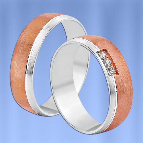 Оригинальное и  модное двухцветное обручальное кольцо из красного и белого золота 585 пробы (матовая и глянцевая текстура) с бриллиантами ( 3 х 0,02 карата)