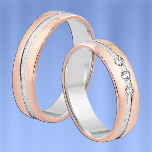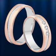 Модное двухцветное обручальное кольцо из красного и белого золота 585 пробы (матовая и глянцевая текстура) с бриллиантами ( 3 х 0,03 карата)
