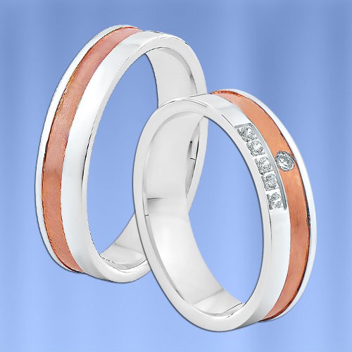 Оригинальное, модное двухцветное обручальное кольцо из красного и белого золота 585 пробы (матовая и глянцевая текстура) с бриллиантами ( 6 х 0,7 карата)