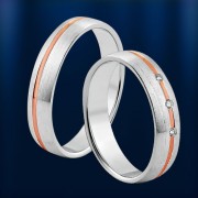Оригинальное, модное двухцветное обручальнлое  кольцо из красного и белого золота 585 пробы (матовая и глянцевая текстура) с бриллиантами (3 х 0,01 карата)
