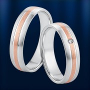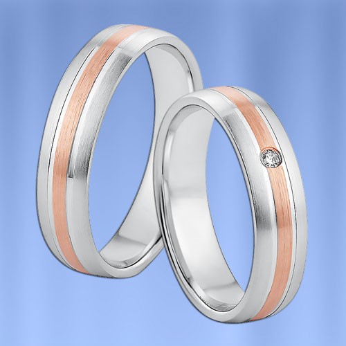 Оригинальное, модное двухцветное обручальное кольцо Европейка из красного и белого золота 585 пробы алмазной обработки (матовая и глянцевая текстура) с бриллиантом (1 х 0,02 карата)