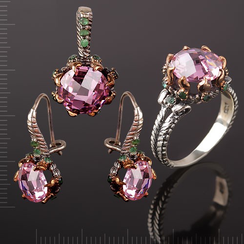 Вставка : Яркий розовый фианит (¢ 8.0 мм), 16 изумрудов ¢ 1.0 мм