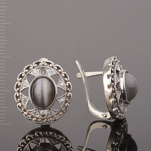 Серьги из серебра 925 пробы с крупной вставкой синтетического улексита (8.0 х 10.0 мм),