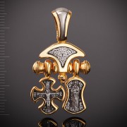 Подвеска: православный крест «Распятие. Хризма», образок «Валаамская икона Божией Матери. Ангел Хранитель» На лицевой стороне креста изображено Распятие Господа Иисуса Христа. На обороте начальные буквы имени Христа образуют древнейший символ Господа – Хризму. Это монограмма Христа в виде пересекающихся букв Х и Р, которые на большинстве языковхристианских народов пишутся одинаково. Рядом с крестом – образок. Нанем на лицевой стороне помещена Валаамская икона Божией Матери, написанная в 1878году иеромонахом Валаамского монастыря о. Алипием. Икона прославилась чудомисцеления мещанки Натальи Андреевой в 1897 году, и с тех почитается как целительница при различных недугах. На обороте образка – икона Ангела Хранителя. Это Ангел, который дается каждому человеку в Крещении для попеченияи защиты его души