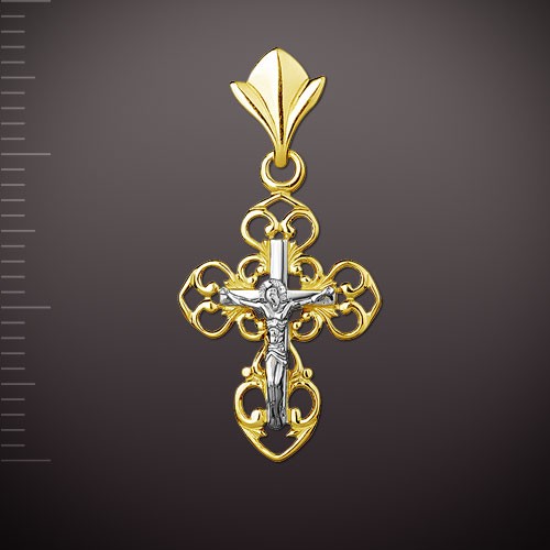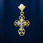Православный крест из русского желтого золота 585 пробы с распятием. На ажурном, с алмазной гранью, основании закреплена отдельно выполненная из