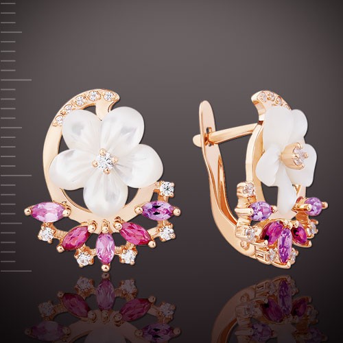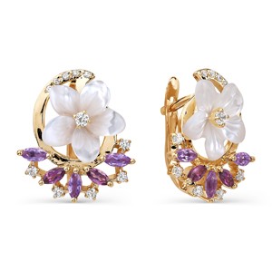 Вставка : 6 аметистов маркиз 4.0 х 2.0 мм 0.3 ct, 2 перламутра в форме ромашки ¢ 12.0 мм, 4 родолитов (маркиз 4.0 х 2.0 мм 0.4 ct), 2 фианита ¢ 2.0 мм, 10