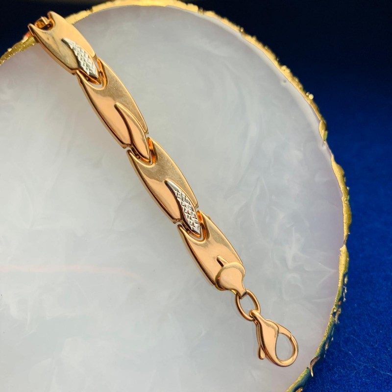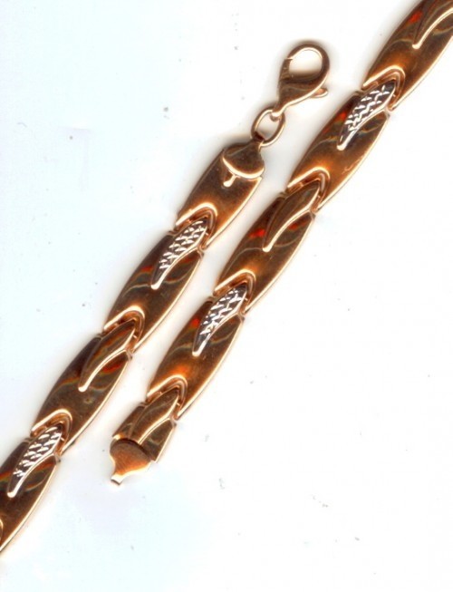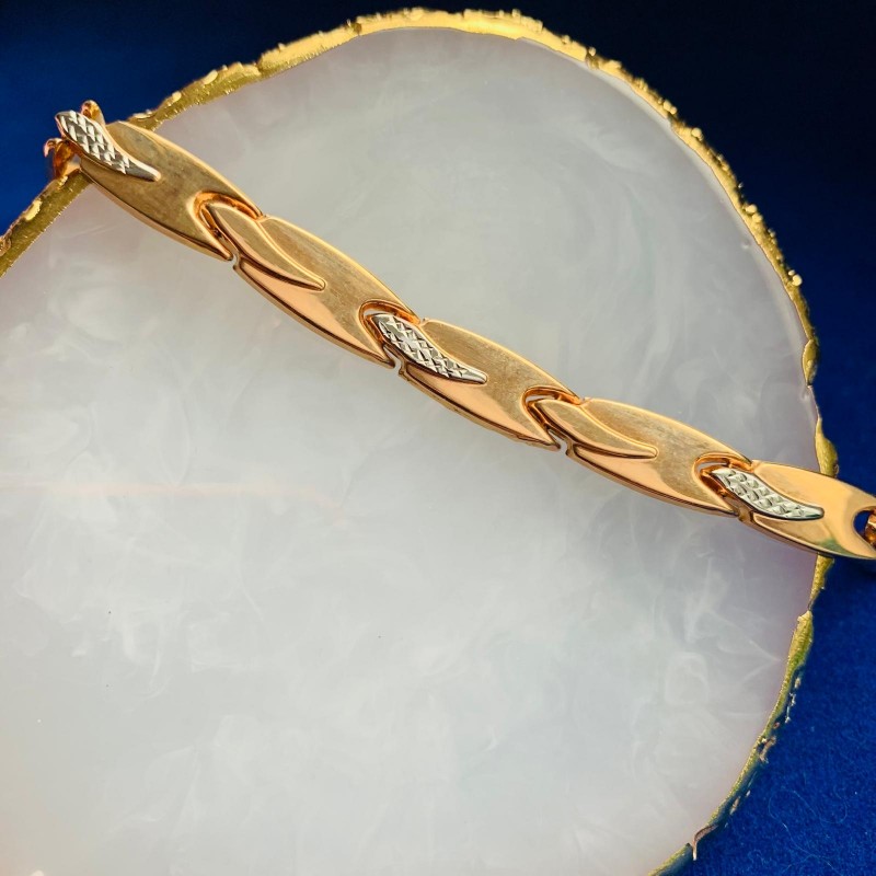 Armband aus Rotgold/Weissgold 585°. Das anmutige und voluminöse Armband aus 585er Weißgold und Rotgold mit funkelndem Diamantschliff. Innenseite des Armbandes ist glatt mit Spiegeloberfläche. Armbänder aus Gold setzen den nötigen Akzent im Bild und machen auf den Reichtum und Luxus der Accessoires aufmerksam, denn Gold ist schön, stilvoll, schick und teuer. Passt sowohl einer soliden Dame als auch einer jungen Frau.