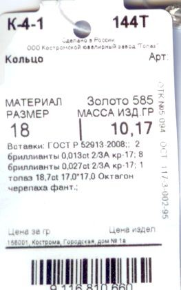 русского золота на одном из предприятий бывшего СССР. Изделие имеет двойную пробу – штамп завода-изготовителя и штамп пробирной палаты о соответствии 585 пробе. На изделии так же имеется закрепленная на опломбированной нитке заводская этикетка-сертификат, на которой указана вся информация о изготовителе и изделии. Покупая данное изделие, вы действительно приобретаете оригинальное ювелирное украшение, выполненное по высоким советским ГОСТам!