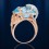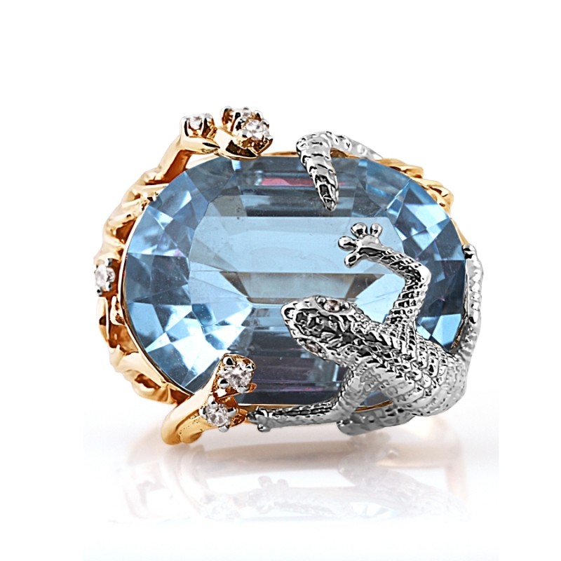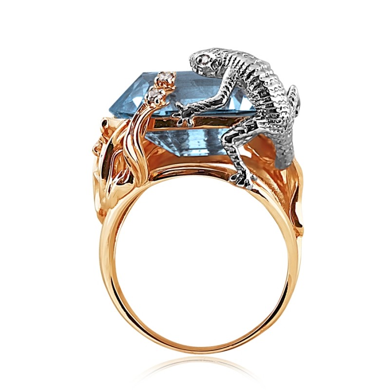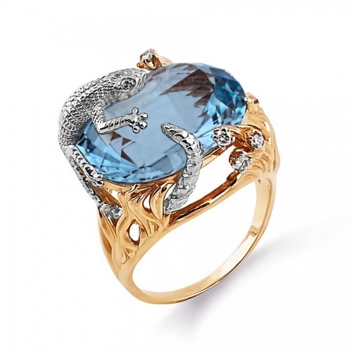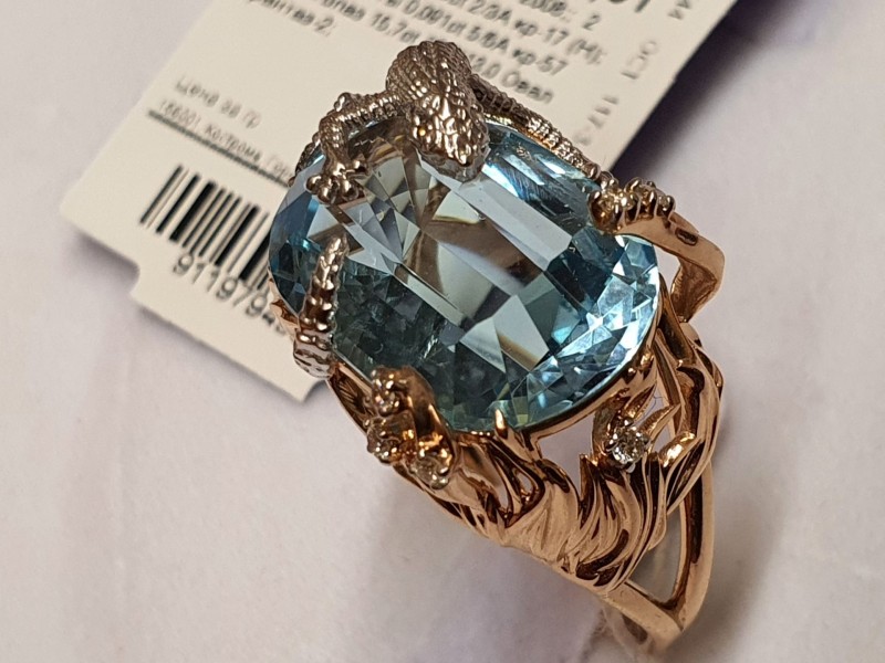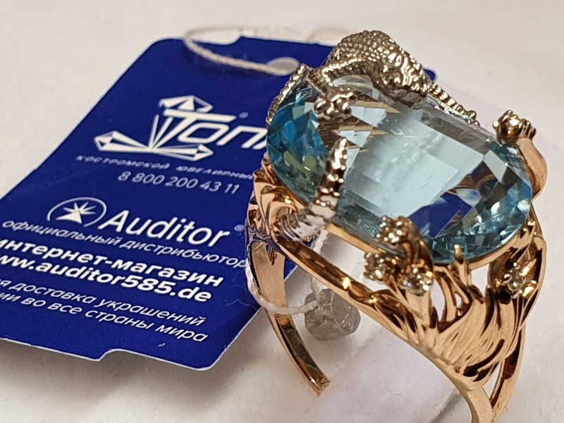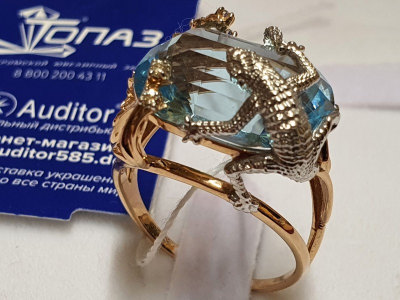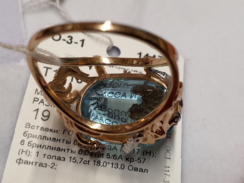 Rotgold von 585 Probe ist ein durchbrochener Korb installiert - ein Halter in Form von Blumen, die mit Diamanten verziert sind, in denen ein riesiger Topas befestigt ist.