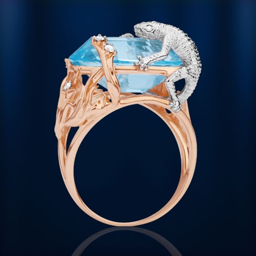 Von unten, aus einem dekorativen Korb, versucht die Magische Eidechse aus Weißgold von 585 Standard auf den Stein zu klettern.