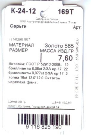 Данное качественное изделие произведено из оригинального русского золота на одном из предприятий бывшего СССР. Изделие имеет двойную пробу – штамп завода-изготовителя и штамп пробирной палаты о соответствии 585 пробе. На изделии так же имеется закрепленная на опломбированной нитке заводская этикетка-сертификат, на которой указана вся информация о изготовителе и изделии. Покупая данное изделие, вы действительно приобретаете оригинальное ювелирное украшение, выполненное по высоким советским ГОСТам!