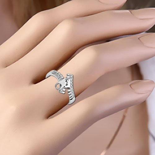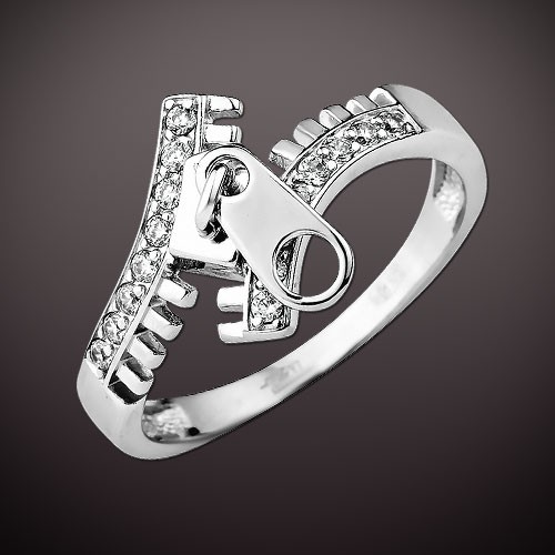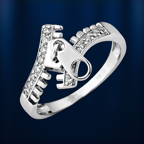 Стильное оригинальное кольцо выполнено из серебра 925 пробы в форме замка - молнии, украшенное сверкающими