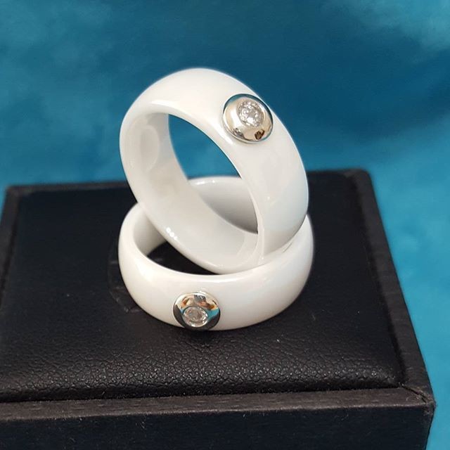 Dezenter Ring aus weißer Keramik. Der Fingerring wird von einer 925er Silberapplikation geziert, die wiederum von vielen weißen Zirkoniasteinen geschmückt wird.