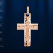 Православный золотой крест нательный с распятием Иисуса Христа. На задней части креста имеется надпись "