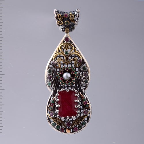 Eine stilvolle und luxuriöse Schmuck - Anhänger mit  großen Insertion Rubin (18.0 x 12.0 mm), die wunderschön von Rubinen (¢ 3.0 mm), Smaragden (¢ 2.0 mm) sind eingerahmt