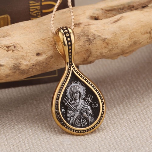 Икона Божией Матери Умягчение злых сердец (Семистрельная). Образок из чернёного серебра 925 пробы, позолоченный 999 проба. Литьё. Ручная работа