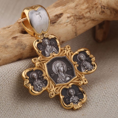 На лицевой стороне креста расположен Нерукотворный образ Господа Иисуса Христа, почитаемый как один из самых сильных защитных символов Православия. Этот образ Господь Сам отпечатлел на плате и послал больному проказой Эдесскому царю Авгарю для исцеления. В лепестках вокруг Спаса изображены евангелисты Матфей, Лука, Иоанн и Марк. На оборотной стороне помещен образ Божией матери "Невская Скоропослушница". В первую очередь перед иконой Божией Матери молятся о духовном прозрении. Само название «Скоропослушница», то есть «внимающая молитве скоро», — утешительно для просящего помощи человека. Через свою икону Богородица дарует помощь в излечении от различных заболеваний, в том числе онкологических. Перед Ее святым образом возносят молитву за детей и о помощи в родах - о рождении здорового ребенка. В лепестках вокруг Богородицы изображены образы мучениц Веры, Надежды и Любови, девочек 12- и, 10-ти и 9-ти лет, и матери их Софии. София благословила дочерей на мученичество во имя Христа. Похоронив дочерей, София умерла на их могиле от горя. Этим святым молятся за детей, благополучии в семье, ищут у них помощи в борьбе с искушениями