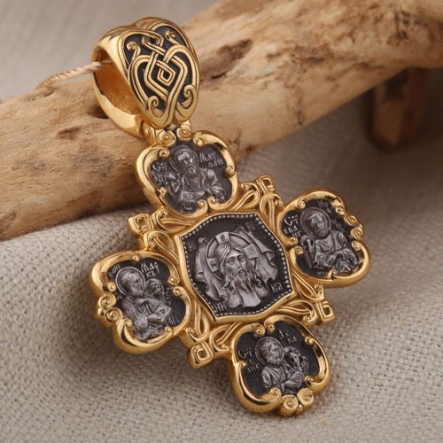 Спас Нерукотворный. Евангелисты Марк, Матфей, Иоанн, Лука. Икона Божией Матери Скоропослушница. Святые Вера, Надежда, Любовь, София. Православный Крест-четырехлистник из чернёного серебра 925 пробы, позолоченный 999 проба. Литьё. Ручная работа