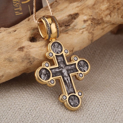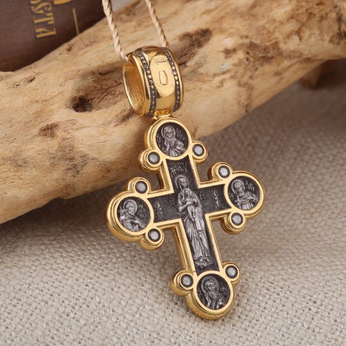 Распятие Христово. Архангелы Михаил и Гавриил. Валаамская икона Божией Матери. Александр Невский, Дмитрий Донской, Сергий Радонежский. Православный крест из чернёного серебра 925 пробы, позолоченный 999 проба. Литьё. Ручная работа