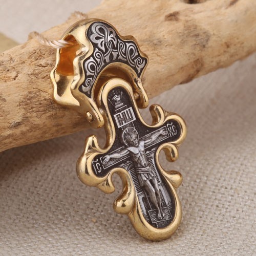 Распятие Христово. Валаамская икона Божией Матери. Православный крест из чернёного серебра 925 пробы, позолоченный 999 проба. Литьё. Ручная работа