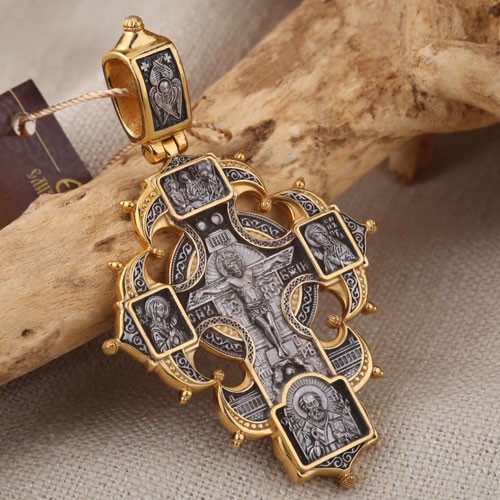 Распятие Христово с предстоящими. Св. Троица. Николай Чудотворец. Ангел-Хранитель. Казанская икона Божией Матери. Блаженная Матрона, Ксения Петербургская. Святые покровители семьи. Православный крест из чернёного серебра 925 пробы, позолоченный 999 проба. Литьё. Ручная работа