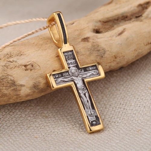Распятие Христово. Молитва Да воскреснет Бог. Православный крест из чернёного серебра 925 пробы, позолоченный 999 проба. Литьё. Ручная работа