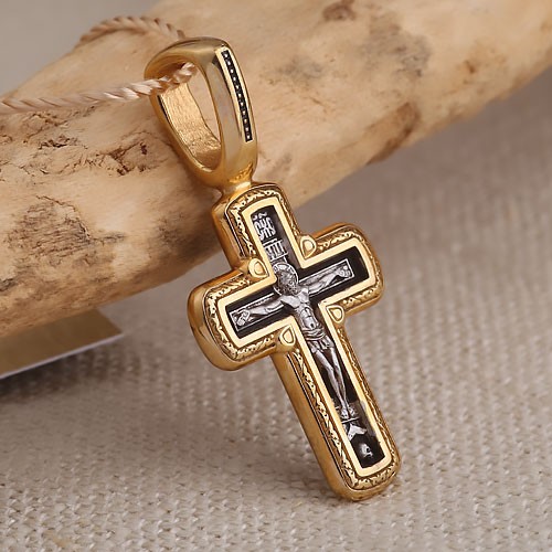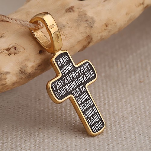 Распятие Христово. Молитва Да Воскреснет Бог. Православный крест из чернёного серебра 925 пробы, позолоченный 999 проба. Литьё. Ручная работа