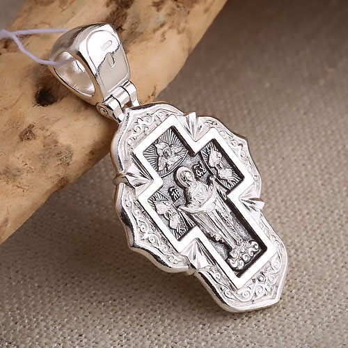 На лицевой стороне креста изображено Распятие Христово с предстоящими Богоматерью и Иоанном Богословом, любимым учеником Христа. По преданию, они стояли рядом с Крестом во время казни. В основании Креста стоят копье и трость, обозначенные буквами К и Т. Это орудия Страстей Христовых.На обороте креста – изображение Покрова Пресвятой Богородицы. Она стоит в молитвенной позе Оранты на облаке, покрывая Своим мафорием все человечество, оберегая его. Вокруг Богоматери – серафимы, Небесные силы