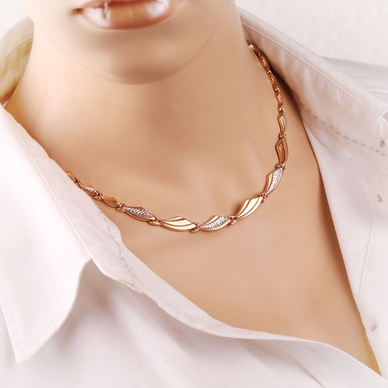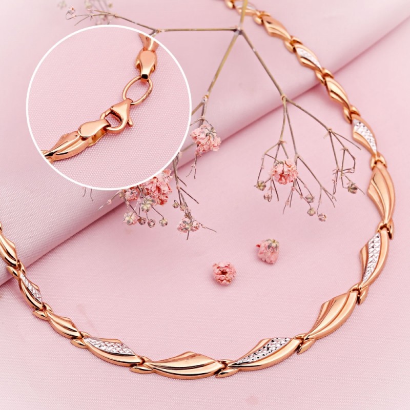 Rotgold mit funkelndem Diamantschliff. Innenseite des Colliers ist glatt mit Spiegeloberfläche. Collier aus Gold setzen den nötigen Akzent im Bild und machen auf den Reichtum und Luxus der Accessoires aufmerksam, denn Gold ist schön, stilvoll, schick und teuer. Passt sowohl einer soliden Dame als auch einer jungen Frau.