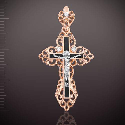 белого золота, на котором закреплена фигурка Христа. Часть креста покрыта черной эмалью. На задней части креста имеется надпись "