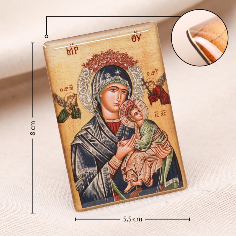 Миниатюрная икона на магнитной основе. Используются краски, устойчивые к выцветанию. Изображение защищено многослойным лаком. Иконы данной коллекции отличаются четкостью линий изображения и сочностью красок.