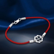 Armband aus roter Textilschnur mit silberner Verschluss und Einsatz in Form von Klee aus 925er Silber. Rhodiniert!