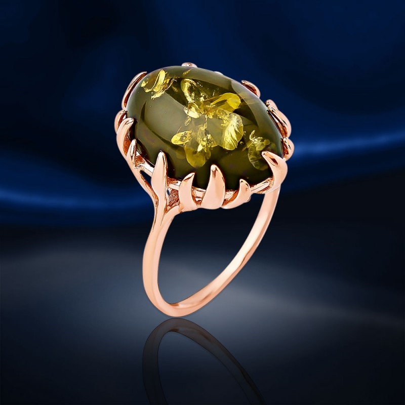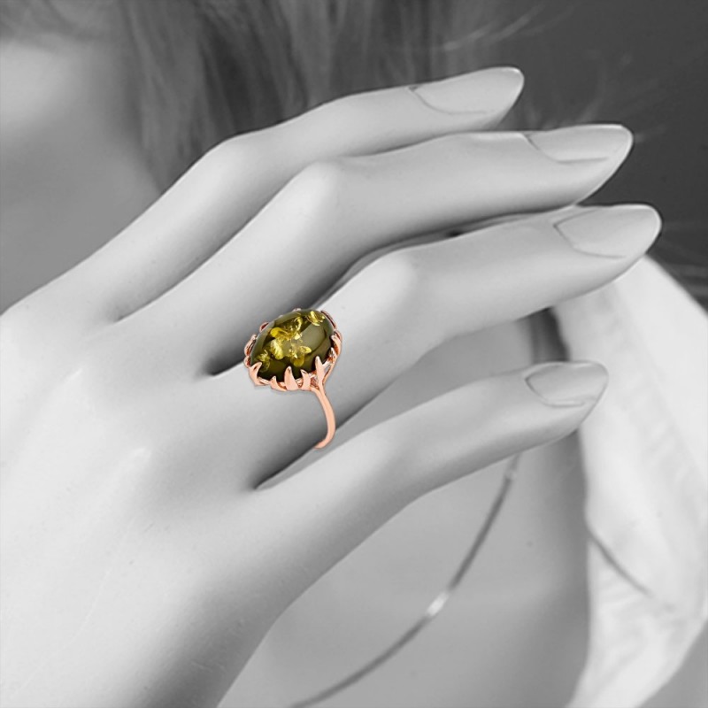 Eleganter Ring aus 925er Silber, vergoldet, verziert mit Bernstein in Grüntönen.