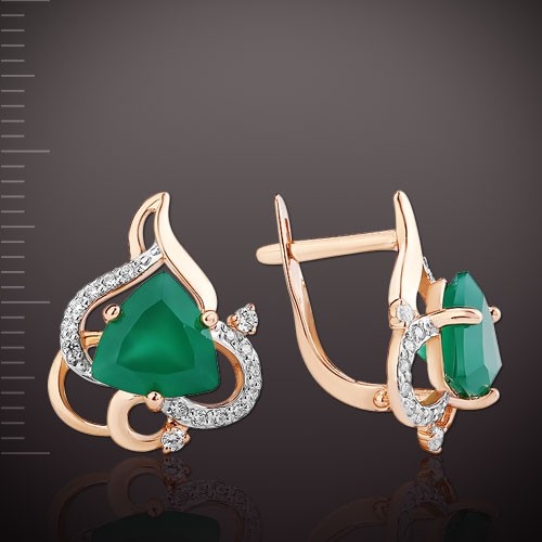 Goldene Ohrringe mit graziösem Muster, hergestellt aus russischem 585er Rotgold, mit Zirkonia und Onyx.