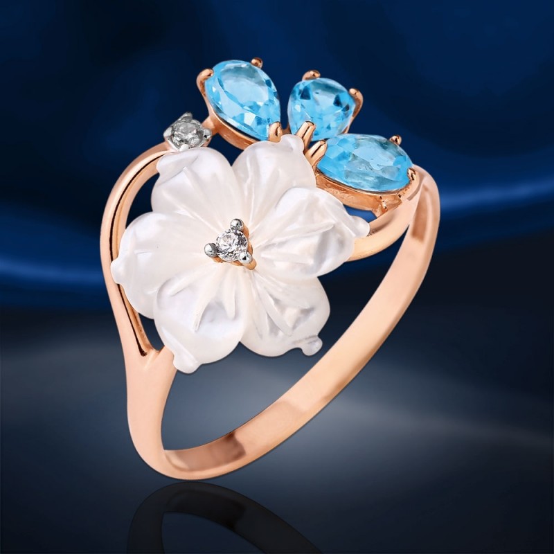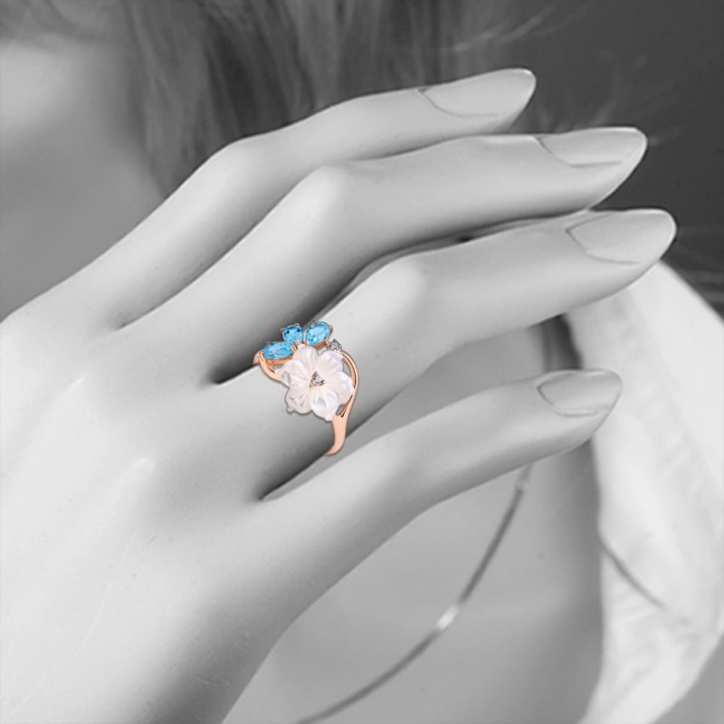 Charmanter Ring aus Silber 925 vergoldet, mit Zirkonia, Perlmutt und Topas Swiss Blue verziert.