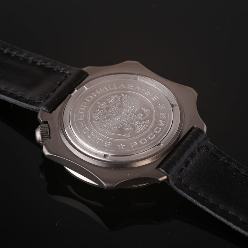 Sehr lange Zeit wurde die Kommandantenuhr mit einem klassischen Design hergestellt, aber das Werk Vostok beschloss auf Nachfrage der Verbraucher, die Modellpalette dieser Serie zu erweitern. Anfangs wurden sie mit einem U-Boot oder einem Panzer auf dem Zifferblatt hergestellt, jetzt ist es möglich, die Symbole eines der Zweige der Streitkräfte der Russischen Föderation zu sehen: Flugzeugträger, Fallschirme, Geschütze, Flugzeuge und vieles mehr. Gleichzeitig sind die Zahlen in großem Druck angefertigt und leuchten zusammen mit den Pfeilen im Dunkeln. Ein Fenster mit dem aktuellen Datum ist ausnahmslos ein charakteristisches Merkmal aller Kommandantenstunden. Uhr mit zentraler Sekunde und Sofortkalender.