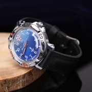 Sehr lange Zeit wurde die Kommandantenuhr mit einem klassischen Design hergestellt, aber das Werk Vostok beschloss auf Nachfrage der Verbraucher, die Modellpalette dieser Serie zu erweitern. Anfangs wurden sie mit einem U-Boot oder einem Panzer auf dem Zifferblatt hergestellt, jetzt ist es möglich, die Symbole eines der Zweige der Streitkräfte der Russischen Föderation zu sehen: Flugzeugträger, Fallschirme, Geschütze, Flugzeuge und vieles mehr. Gleichzeitig sind die Zahlen in großem Druck angefertigt und leuchten zusammen mit den Pfeilen im Dunkeln. Ein Fenster mit dem aktuellen Datum ist ausnahmslos ein charakteristisches Merkmal aller Kommandantenstunden. Uhr mit zentraler Sekunde und Sofortkalender.