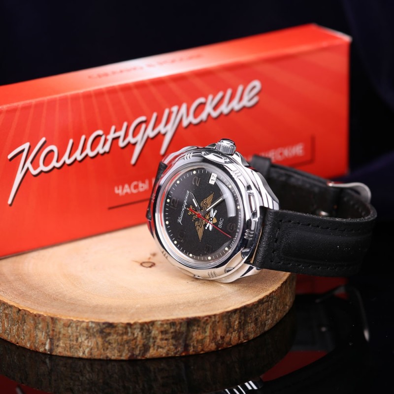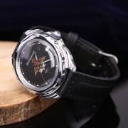 Sehr lange Zeit wurde die Kommandantenuhr mit einem klassischen Design hergestellt, aber das Werk Vostok beschloss auf Nachfrage der Verbraucher, die Modellpalette dieser Serie zu erweitern. Anfangs wurden sie mit einem U-Boot oder einem Panzer auf dem Zifferblatt hergestellt, jetzt ist es möglich, die Symbole eines der Zweige der Streitkräfte der Russischen Föderation zu sehen: Flugzeugträger, Fallschirme, Geschütze, Flugzeuge und vieles mehr. Gleichzeitig sind die Zahlen in großem Druck angefertigt und leuchten zusammen mit den Pfeilen im Dunkeln. Ein Fenster mit dem aktuellen Datum ist ausnahmslos ein charakteristisches Merkmal aller Kommandantenstunden. Uhr mit zentraler Sekunde und Sofortkalender.