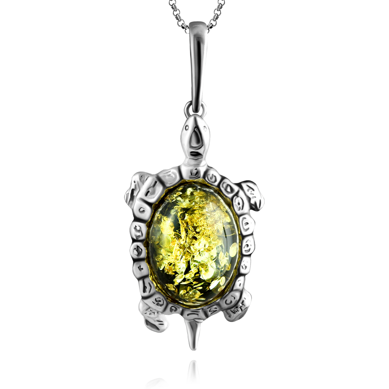 Ein charmanter Anhänger in Form einer Schildkröte aus 925er Silber mit einer Rhodiumbeschichtung und einzigartigem grünem Bernstein, mit diesem erstaunlichen "Stück der Sonne", das mit allen Grüntönen spielt.