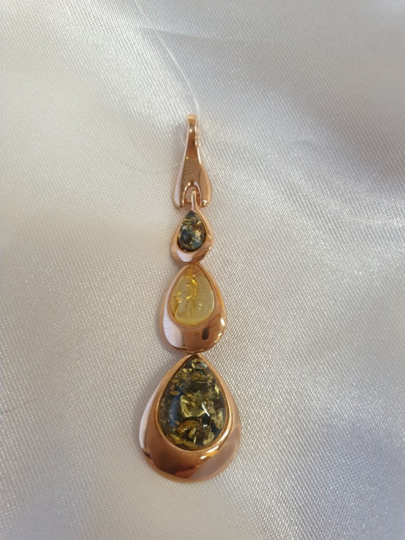 Очаровательная подвеска из позолоченного серебра 925 пробы с уникальным янтарём, с этим удивительным «кусочком солнца», играющим всеми оттенками зелёного, краснового и медового цвета.