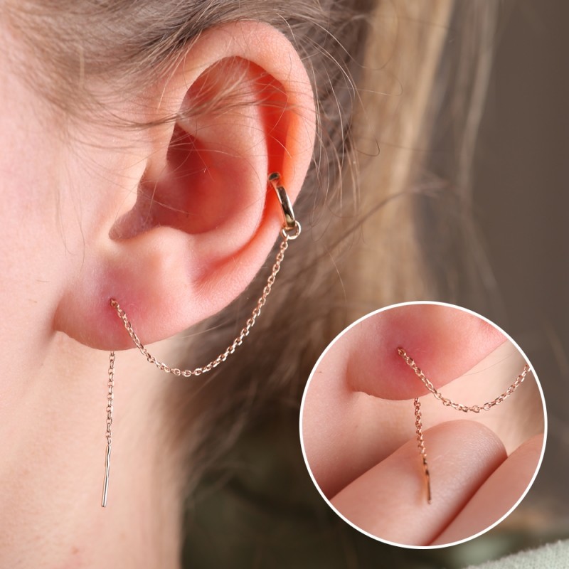 Manschettenohrringe werden normalerweise mit einem speziellen Clip am Band oder an der äußeren Locke der Ohrmuschel befestigt. Das Befestigungsmetall ist sehr formbar und ermöglicht es Ihnen, die Dekoration so fest am Ohr zu befestigen, dass die Möglichkeit, sie zu verlieren, fast Null ist.