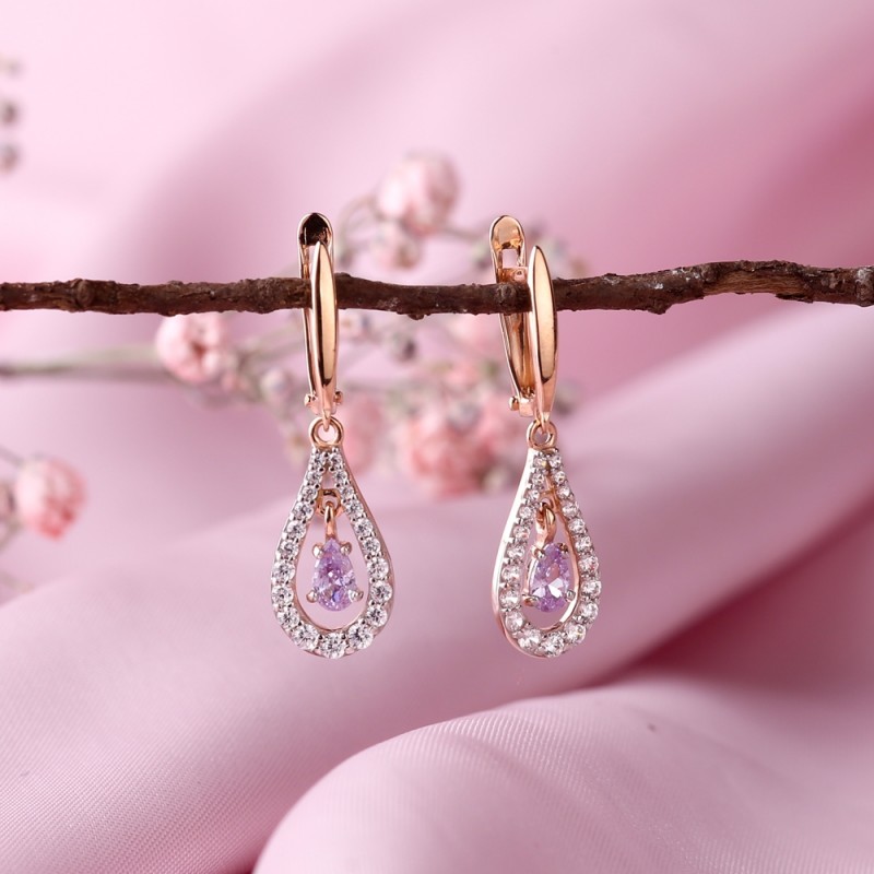 красного золота 585 пробы со сверкающим кубическим цирконием. Два куб. циркония подвешены, что создаёт эффект танцующего циркония, притягивающего взгляд своим сверканием. Родированное покрытие!