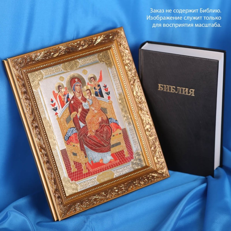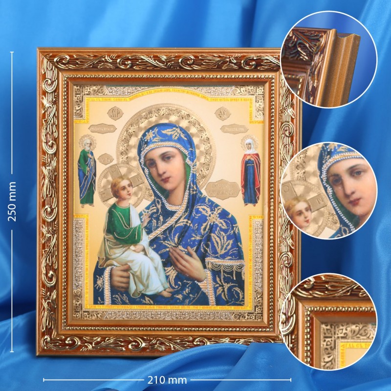 Ikone ortodox  in einem vergoldeten Reliefrahmen aus Holz. Prägung mit "Gold"- und "Silber"-Farben. Die Ikone befindet sich unter Glas, das sie vor Staub und Ausbleichen schützt. Auf der Rückseite der Ikone befindet sich ein Loch zur Befestigung an der Wand.