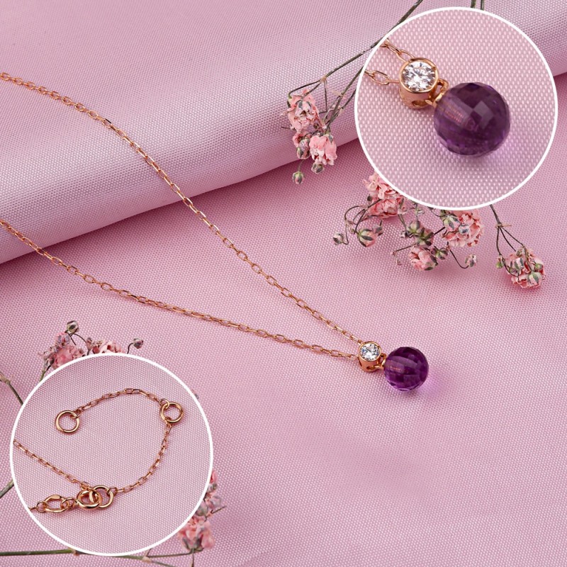 Rotgold mit Einsatz von funkelnden Zirkonia und Amethyst. Ankerweberei