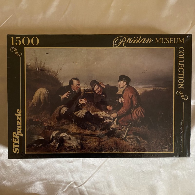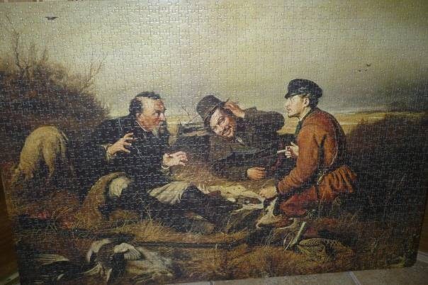 Die Handlung des Puzzles basiert auf einer Reproduktion des Gemäldes "Jäger auf der Rast" - einem Gemälde des russischen Künstlers Vasily Grigoryevich Perov, das 1871 gemalt wurde und zur späten Schaffensperiode des Künstlers gehört.