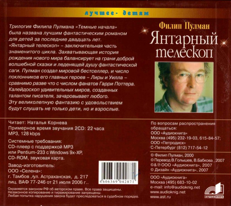 Трилогия Филипа Пулмана "Темные начала" была названа лучшим фантастическим романом для детей за последние двадцать лет. "Янтарный телескоп" - заключительная часть знаменитого цикла. Захватывающая история рождения нового мира балансирует на грани доброй волшебной сказки и леденящей душу фантастической саги. Пулман создал мировой бестселлер, и число поклонников его главных героев - Лиры и Уилла - сравнимо разве что с числом фанатов Гарри Поттера. Калейдоскоп удивительных миров, созданных талантом писателя, зачаровывает любого. Эту великолепную фантазию с удовольствием будут слушать не только дети, но и взрослые.