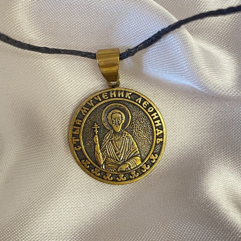 Bronzene Anhängerikone auf einer schwarzen starken Schnur.