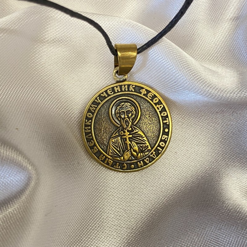 Bronzene Anhängerikone auf einer schwarzen starken Schnur.